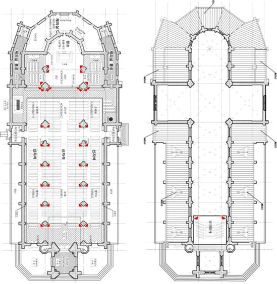 The foremost value in cathedral architecture is the appropriate structure for religious architecture and large space; hence, shapes, sizes, and finishing materials inside the buildings, which can determine the acoustical characteristics, are very difficult to change. In this regard, it is necessary to overcome acoustic limitations, and various methods using a public address system based on electro acoustics have been proposed in recent years. Recently, studies on practical research on acoustic designs of cathedrals around Europe have been underway and are mainly about the harmony of architectural acoustics and electro acoustics characteristics. Some of the typical studies propose a prediction model to improve acoustical characteristics in cathedrals of Apulia in Italy (Cirillo and Martellotta, 2003 ) and the acoustical characteristics according to speaker location in cathedrals in Tudela, Spain (Arana et al., 2008 ), and complement the public address system in a cathedral in Münster, Germany (Behler and Vorländer, 2013 ).
