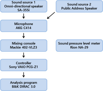 The acoustical measurements were conducted based on ISO 3382-1. Multi-MLS (maximum length sequence) was generated by an omni-directional loud speaker as a sound source based on the DIRAC 3.0 acoustical analysis program of B&K, and seven acoustical parameters were calculated, including sound pressure level (SPL), early decay time (EDT), reverberation time (RT60 ), clarity (C80 ), definition (D50 ), initial time delay gap (ITDG), and rapid speech transmission index (RASTI). Fig. 2 shows the setup used for the measurements.