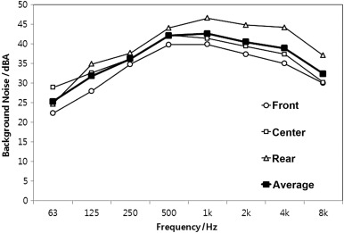 Fig. 5 shows measurement results (the value of each measurement point and the average value of three measurement points) of the background noise per frequency measured at the front, center, and rear of the center aisle in the ground floor of Myeong-dong Cathedral. The average value was 42.6 dBA at 1 kHz and relatively loud noise was measured at a frequency band from 500 Hz to 2 kHz. In particular, the rear area of the cathedral, which was adjacent to the main entrance, showed high background noise compared to that of the front and center areas of the center aisle, which was due to the effect of noise introduced from the cathedral square.