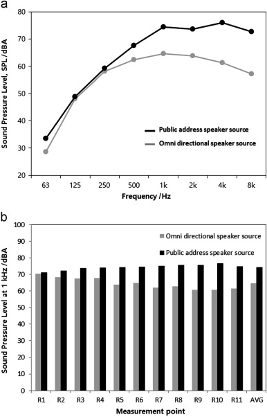 Fig. 6. (a). Comparison of the SPL between the public address speaker sound source and the omni-directional speaker sound source. (b). Comparison of the SPL at 1 kHz between the public address speaker sound source and the omni-directional speaker sound source by each measurement point. |