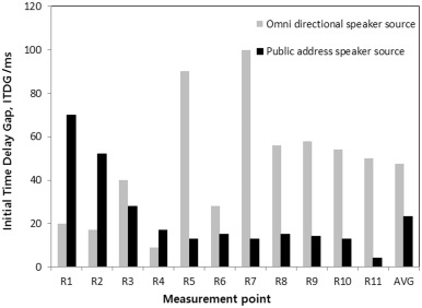 Fig. 11. Comparison of the ITDG between the public address speaker sound source and the omni-directional speaker sound source. |