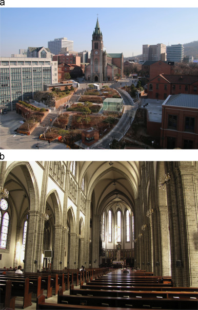 Fig. 1. (a) Panoramic view; (b) Indoor view of Myeong-dong Cathedral (image courtesy of the official website of Myeong-dong Cathedral: http://www.mdsd.or.kr ). |
