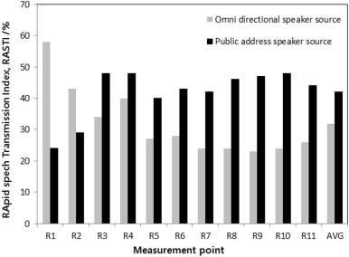 Fig. 12. Comparison of the RASTI between the public address speaker sound source and the omni-directional speaker sound source. |