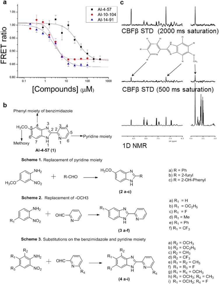Identification of pharmacophore. A. FRET assay results for AI-4-57, AI-10-104, and AI-14-91. Cerulean-Runt domain and Venus-CBFβ concentration was 100 nM. X-axis indicates compound concentration and y-axis is ratio between the emission intensities at 525 and 474 nm. Experiments were performed in duplicate. Error bars represent average ± standard deviation. The average data points were fit using Origin. B. Schemes 1–3 illustrate the targets of modifications to AI-4-57 as well as compounds synthesized and assayed to delineate the active pharmacophore. C. Results of STD NMR experiment with AI-4-57 (2 mM) and CBFβ (200 μM). Bottom panel shows 1D NMR spectrum of AI-4-57. Upper 2 panels show STD difference spectra (off-resonance (70 ppm) saturation spectrum minus on-resonance (0.4 ppm) CBFβ saturation spectrum) with saturation times of 500 and 2000 ms.