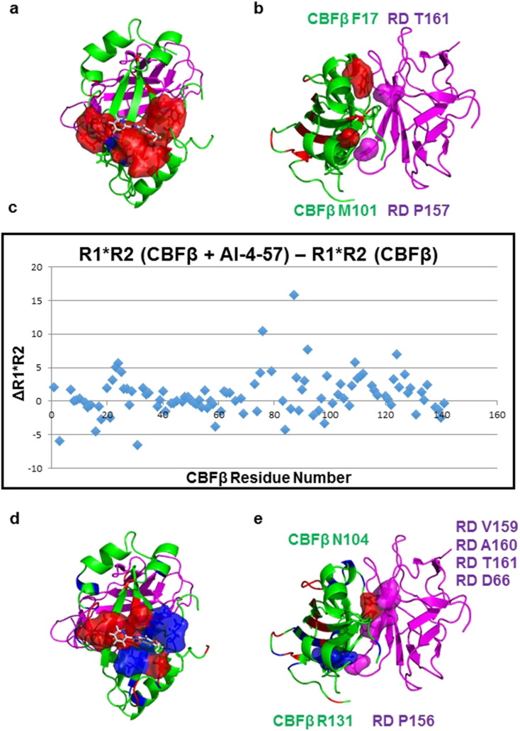 Wildtype CBFβ (1-141) and CBFβ (1-141) mutants R90E, K98E and K111E were expressed at 15 °C in 15 N labeled minimal media. Proteins were purified using a Ni-NTA column, cleaved with rTev protease digestion overnight followed by size exclusion chromatography to remove the affinity tag and impurities. Protein samples at 150 μM were dialyzed, inserted into an NMR buffer, and titrated with 600 μM AI-4-57. All 15 N-1 H HSQCs were recorded on a Bruker 800 MHz NMR spectrometer equipped with a cryoprobe.