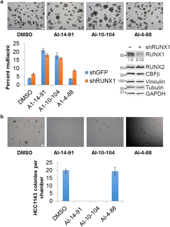 RUNX-mediated gene expression is important for normal breast epithelial biology and breast cancer (LAU et al., 2006 , PRATAP et al., 2006 , PRATAP et al., 2009 , SHORE, 2005 , KADOTA et al., 2010  and VAN BRAGT et al., 2014 ). To evaluate whether CBFβ inhibition would influence the multicellular organization of basal-like breast epithelia, we used 3D culture of MCF10A-5E cells (Janes et al., 2010 ). Knockdown of RUNX1 in these cells delays proliferation arrest and promotes the formation of non-spherical acini, indicating a role for RUNX1 during morphogenesis (Wang et al., 2011 ). When shRUNX1 or control cells were cultured with CBFβ inhibitors at 1 μM concentration, we observed a substantial increase in the formation of multiacinar structures compared to carrier control or inactive compound (Fig. 7 a). The extent of multiacinus formation greatly exceeded that of RUNX1 knockdown, suggesting a phenotypic role for other RUNX-family members such as RUNX2, which is also expressed in these cells (Wang et al., 2011 ). The inhibitors appear to be initiating a nascent branching program that is reminiscent of when TGFβ-family signaling is impaired (Wang et al., 2014 ). RUNX transcription factors are well-recognized effectors of TGFβ-family ligands (Ito and Miyazono, 2003 ), which are naturally retained in the extracellular matrix (SCHNEYER et al., 2008  and TAIPALE et al., 1996 ).