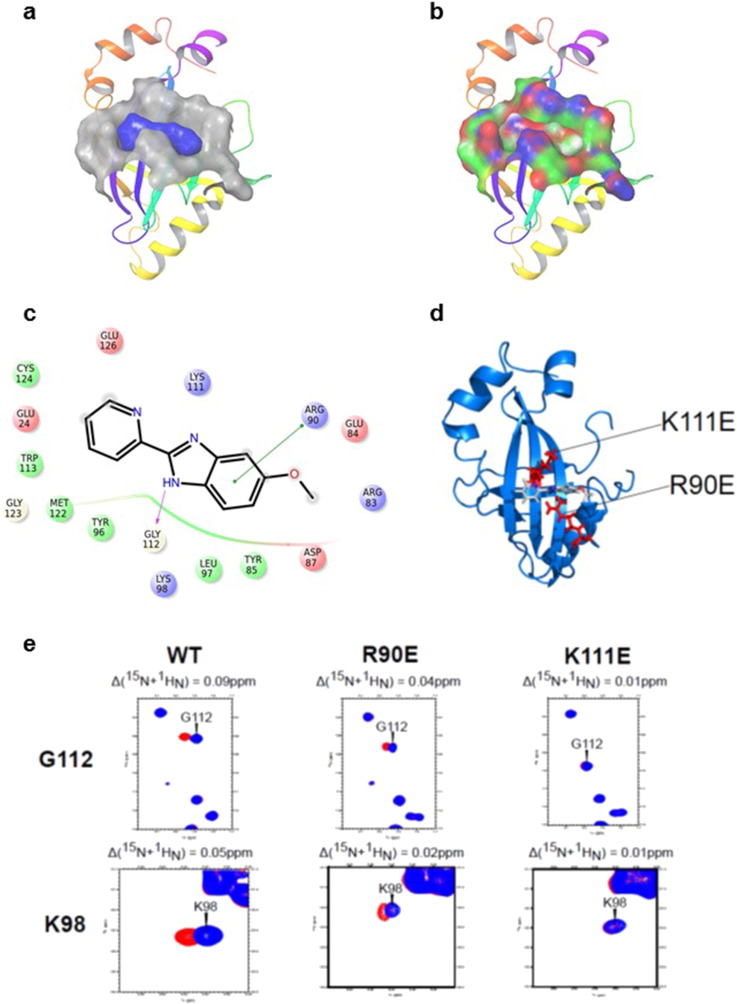 In Grid Generation, under docking tab we have used the site as a centroid of binding site residues in the protein. The active site residues were determined by chemical shift perturbations in 15 N-1 H and 13 C-1 H HSQC NMR experiments of protein binding to AI-4-57. The following residues were selected for grid generation: V86, L88, R90, E91, Y96, K98, A99, K111, G112, W113, M122, G123, C124. Docking was carried out using the Virtual Screening Workflow framework. All the compounds were docked flexibly and after docking 100% of best compounds with all good states were scored by MM-GBSA.
