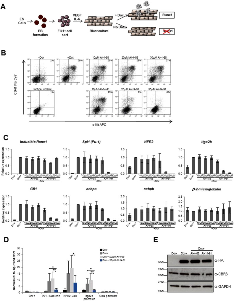 Effects of CBFβ inhibitors on RUNX1 occupancy and target gene expression. A. Schematic diagram representing the inducible Runx1 (iRx) ES cell differentiation system. ES cells were allowed to form embryoid bodies (EB) in IVD culture media and hemangioblast Flk1 + ve cells were sorted and seeded into blast culture media and cultured for 40 h. In the absence of doxycycline (− dox) RUNX1 is absent and cells cannot progress from the HE1 stage of development. In the presence of doxycycline (+ dox) Runx1 is expressed and differentiation progresses, resulting in the formation of CD41 + ve/KIT + ve progenitors. B. Representative FACS histograms showing staining of the surface markers CD41 and KIT in cells treated with the compounds and dox as indicated. The percentage of cells expressing KIT and CD41 is reduced by treatment with AI-14-91 but not with the control compound AI-4-88. C. Gene expression analysis of inhibitor treated cells using RNA prepared from cells treated with and without dox and cells treated with 10 μM, 20 μM and 30 μM AI-14-91 or AI-4-88 in the presence of dox. Relative expression of genes is shown, normalized to GAPDH and using + dox as the calibrator. Error bars represent standard deviation where n = 3. D. ChIP analysis of HA-Runx1 binding following Runx1 induction by dox and treatment with inhibitor or control compound. ChIP with an anti-HA antibody recognizing HA tagged Runx1 was used to identify binding at selected amplicons and enrichment normalized to input and the Chr2 control is shown. Error bars represent standard deviation where n = 5. A one-way ANOVA test was used to analyze variance in HA enrichment values between the inhibitor and control compound, or between inhibitor and + dox treatment, * denotes p < 0.05 and ** denotes p < 0.01. E. Representative western blots showing levels of inducible Runx1 and CBFβ protein in the cell populations. Where indicated, cells were treated with 20 μM inhibitor or control compound.