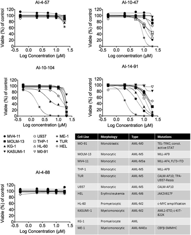 Effects of CBFβ inhibitors on the viability of a panel of leukemia cell lines. Percent viability for 11 leukemia cell lines after 48 h of treatment with the indicated compounds. The viability is represented as the percent DAPI negative cells relative to DMSO control. Each symbol/color represents an individual cell line. The symbol represents the mean of independent replicates and the error bars represent the S.E.M. The table indicates the morphology, type of leukemia, and known mutations for each of the 11 cell lines.