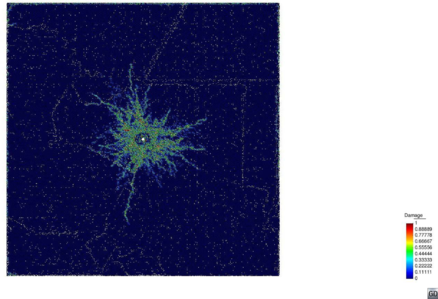 Figure. Effect of a controlled explosion in a cylindrical cavity on the fracture of a rock mass. Above figure: Long pulse. Below figure: Short pulse. Results obtained at CIMNE with the DEM-FEM technology.