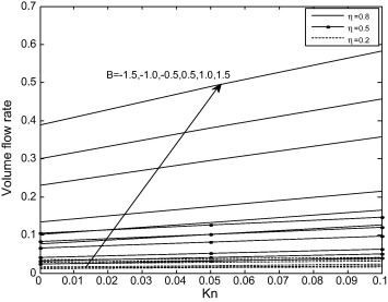 Fig. 6 reveals the influences of rarefaction parameter and viscosity variation parameter on volume flow rate It is observed from Fig. 6 that, the volume flow rate increases, as viscosity variation parameter increases. In addition, it is interesting to note that increase in rarefaction parameter leads to increase in the volume flow rate.
