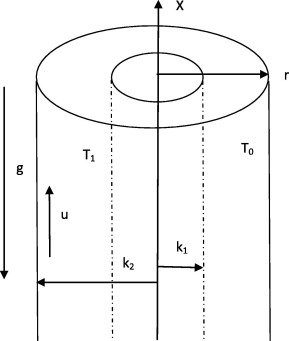 Consider a steady fully developed natural convection flow in a vertical annular micro-channel with temperature dependent viscosity in the presence of velocity slip and temperature jump at the annular micro-channel surfaces. A schematic geometry of the problem under investigation is shown in Fig. 1, where X-axis is parallel to the gravitational acceleration g but in the opposite direction while the r -axis is in the radial direction. The radius of the inner and outer cylinder walls is and , respectively. The outer surface of the inner cylinder is heated to a temperature greater than that of the surrounding fluid having temperature and the inner surface of the outer cylinder is maintained at temperature . Due to this temperature difference, natural convection occurs in the vertical annular micro-channel. Since the flow is fully developed and cylinders are of infinite length, the flow depends only on radial coordinate . Using Boussinesq’s approximation and considering temperature dependent viscosity, the governing momentum and energy equations, describing the present physical situation can be written in dimensional form as follows: