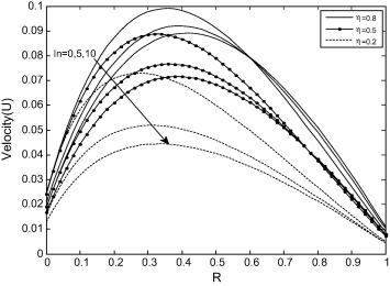 Figure 3. Velocity profile for different values of ln with Kn = 0.05, B = 0.5. |