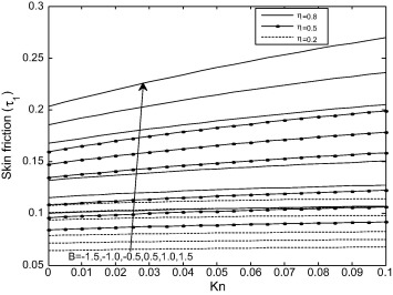 Figure 9. Variation of skin friction on the inner cylinder with Kn at different values of B. |