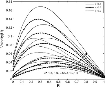 Fig. 3 depicts the effect of fluid–wall interaction parameter on the velocity distribution for fixed values of and . It is evident from Fig. 3 that, the increase in fluid–wall interaction parameter leads to the decrease in fluid velocity and increase in slip velocity near the outer surface of the inner cylinder while reverse trend is observed at inner surface of the outer cylinder. In addition, the slip induced by fluid–wall interaction parameter increases as radius ratio decreases while the impact of fluid–wall interaction parameter on the slip is more visible for smaller radius ratio .