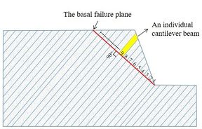 Numerous studies have been conducted on the assessment method of anti-dip rock slope stability. In this study, the numerical analysis based on the strength reduction method is considered a feasible choice for evaluating stability. This is because all the numerical models for the coupled analysis of the seepage-stress field have been established in Section 3, and it has previously been employed by Azarafza et al. [51] for assessing the stability of a complex secondary toppling failure case. However, there are two issues that may arise when implementing the strength reduction method in the GDEM numerical models. The first issue is the unfavorable computation cost due to the coupled analysis of the seepage-stress field. The second issue is the absence of a reliable criterion for determining the FoS in discrete element method modeling [52]. Therefore, this study utilizes the cantilever limit equilibrium method proposed by Aydan et al. [14] to evaluate the stability of the anti-dip layered rock slope.