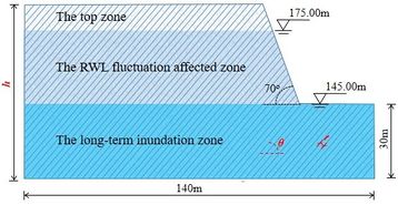 The conceptual model has a length of 140 m, with the reservoir water located on the right side of the model. The impoundment of the Three Gorges reservoir began in June 2003 and was completed in October 2010. Currently, on a hydrological year basis (October-September), the RWL fluctuates between 145 m during the wet season (May-September) for flood control and 175 m during the dry season (October-May) for hydropower generation. This creates a 30m height fluctuation zone for the RWL, as shown in Figure 1. The model includes a 30m height region below 145 m to account for the differences in physical and mechanical properties between rocks in the RWL fluctuation affected zone and the long term inundation zone.