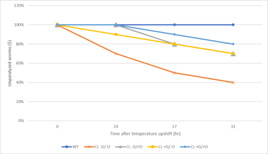 The results of Figure 4 are consistent with that of Trial 1 in which all treatment groups had a higher percentage of unparalyzed C. elegans compared to CL -G/-O. WT had the lowest percentage of unparalyzed worms throughout the trial, except at Hour 0. Among all treatment groups with C. elegans exhibiting Aβ aggregation, CL +G/+O (combined treatment) had the highest percentage of unparalyzed C. elegans (80%) at 31 hours following the temperature upshift. The CL-G/+O and CL+G/-O groups both had 70% unparalyzed C. elegans 31 hours after a temperature upshift. Therefore, treatment with sole ginseng, sole omega-3, and a combination of ginseng and omega-3 all showed alleviation of Aβ aggregation effects, with the combination treatment exhibiting the greatest effect in Trial 2 of the paralysis assay.