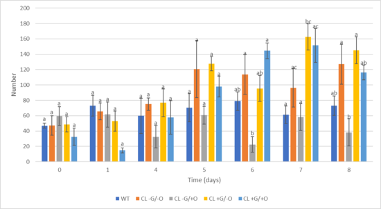 Figure 2 shows population growth throughout the whole assay, with CL +G/-O and CL +G/+O showing higher populations compared to WT from Day 5. At Day 6, CL +G/+O (combined treatments) had a statistically significantly higher population than the CL -G/+O group. Similarly, at Day 7, CL +G/-O had statistically higher growth than WT along with Day 8, demonstrating a significantly higher population compared to CL -G/+O.