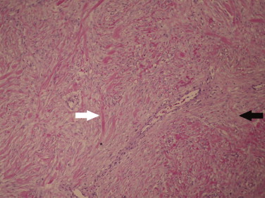 Figure 2. Photomicrograph of the tumor reveals a mesenchymal, spindled hypocellular proliferation in a stromal matrix, containing small to medium size blood vessels, composed by thick, eosinophilic collagen fibers (white arrow) with an admixture of more thin and light collagen fibers (black arrow) (hematoxylin-eosin, ×100). |