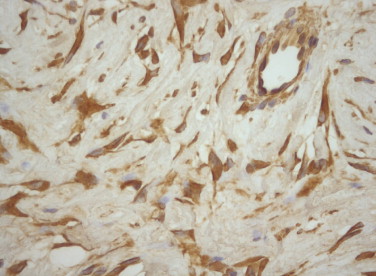 Microscopically, the tumor was a mesenchymal, spindled hypocellular proliferation, with cytonuclear atypia sparse or absent. These cells were in a stromal matrix containing small to medium sized blood vessels, composed of thick, eosinophilic collagen fibers with an admixture of thinner and lighter collagen fibers. Necrosis or mitotic figures were absent (Fig. 2 ). Immunohistochemical analysis showed that the neoplastic cells reacted positively with vimentin (Fig. 3 ) and focally with desmin. Immunoreactivity was negative for: smooth muscle actin, CD117, B-catenin, ALK, CKAE1-AE3, CA5.2, Calretin, WT1, trombomodulin, S100, CD68, CD99, bcl2 and IgG4.