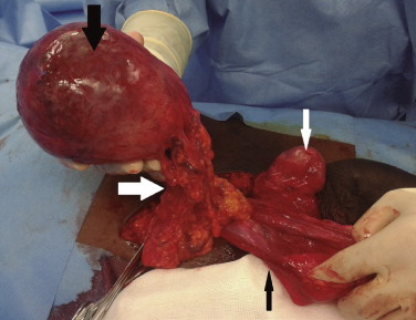 Figure 1. Appearance of the structures inside the right scrotum of the patient during the surgery; inside the right scrotum the patient had a healthy right testicle (thin white arrow) and spermatic cord together with an indirect inguinal hernia which sac (thin black arrow) was surrounding the big mass (thick black arrow); this mass was linked to the epiploon and splanchnic/mesenteric circulation (thick white arrow). |