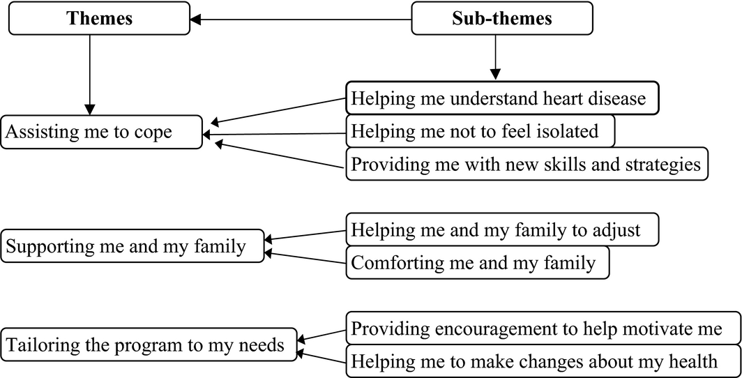 A total of 13 phone interviews were undertaken, comprising of seven female and six male participants. Ages of the participants ranged from 46–69 years with the majority living between 50–100 kilometres from the nearest hospital-based outpatient CR programme. Characteristics of the patients who participated in the telephone interviews are detailed in Table 2. Findings from the patient telephone interviews revealed several subthemes which were coded, organized and presented in three themes (Figure 1): assisting me to cope, helping me to understand heart disease and tailoring the programme to my individual needs. The first and second themes reflected participants’ focus on mentors with fewer comments about the AHGP itself.