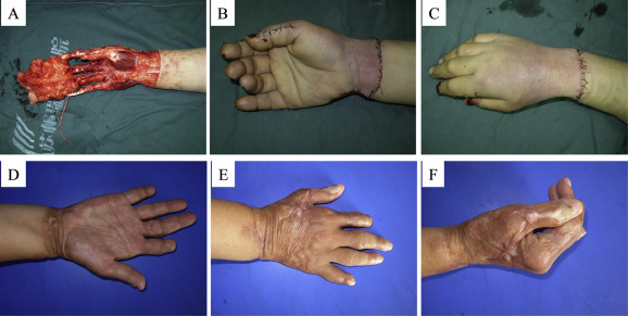 Case 1 (female; age, 43 years): The total hand degloving injury was caused by compaction of printing machine roller, and she was hospitalized 2 hours later. An examination of her hand showed that the degloving injury occurred at the left hand from the distal forearm to the fingertips. Both the deep fascia of the forearm and the muscle units remained intact. Acute debridement was performed under brachial plexus block, and then six dorsal hand veins, five palmar veins, and the ruptured common palmar digital artery were anastomosed. The dorsal skin and palmar skin of the hand were slightly thinned and dressed with light pressure. After 12 days, the replanted skin and the five fingers survived. After 12 months, there was repeated exudate at the distal index finger. X-ray showed absorption of the ungual phalanx. Therefore, distal finger amputation was performed. Follow-up 2 years later showed that the texture of the palm and dorsum of the hand was good, and the finger shape was excellent. The thumb abduction function, and finger flexion and extension functions recovered satisfactorily. The sensory function of the fingers was restored to Grade S2–S3 ( Fig. 1).