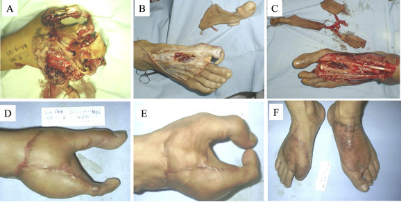 Case 2 (male; age, 24 years): The total hand degloving injury was caused by compaction of printing machine roller. He was hospitalized 1 hour later. An examination of his hand showed that the degloving injury occurred at the left hand. The skin was damaged from the proximal palm and dorsum of the hand to the fingertips. The phalangeal joints, tendon, nerve, and intrinsic muscles of the hand were relatively complete. Classic acute debridement was performed under a combination of brachial plexus block and epidural anesthesia, reserving the thumb. The fingers 2–5 were amputated at the metacarpophalangeal joint. The hallux nail flap with the right foot dorsal flap was used to reconstruct the thumb and repair the radical skin defect of the palm and dorsum of the hand (tigers mouth area). The second toe wrap-around flap with left foot dorsal flap was used to reconstruct the middle finger and repair the ulnar skin defect of the palm and the dorsum of the hand. After surgery, all the middle finger and thumb flaps survived. Follow-up after half a year showed that the flaps of palm and dorsum of the hand were not bulky, and the abduction function of the thumb was recovered. The flexion and extension functions of the metacarpophalangeal joint were normal, and could complete the digital opposition motion. The sense of the reconstructed finger and flap was recovered to Grade S2, with good healing in the donor site in the foot skin. There was no obvious cicartricial contracture in the replanting area or problems with walking ( Fig. 2).