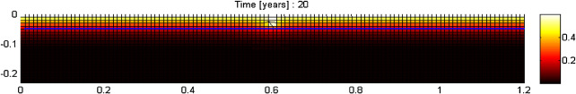 If we add to the previous solution of the bridge deck with a crack and ordinary concrete (P1EB) asphalt overlay and waterproof insulation with a defect 40 cm from the left hand margin we obtain a model corresponding to the traditional solution in central Europe. It is assumed that the area of the defect in the barrier will grow by 1 cm per year. The below mentioned output is for 20 and 40 years: the size of the defect in the waterproof insulation here corresponds to an unmeasured age and is 20 cm for 20 years or 40 cm for a 40 year age. In the concentrations of chlorides it is clear that the surface concentration representing a defect in the waterproof insulation is localized to the area of the defect and the area of the defect grows in time. Fig. 4 shows the chloride concentration plot for bridge deck with asphalt overlay.