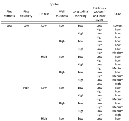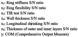 Pipe ring stiffness and flexibility are desirable to have the highest possible values. Thus, the higher the better function was used for calculation of their S/N ratios (Eq. (1)). For the TIR test and longitudinal shrinkage, the lowest possible values are desired so the lower the better function was selected for calculation of their S/N ratios (Eq. (2)). S/N ratios for the wall thickness and the thickness of the outer and inner layers are obtained by Eq. (3) since those two characteristics require nominal measures (nominal is the best function).