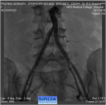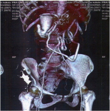 A 35-year-old female presented with dull aching pain in right loin for the last 3 months. She was diagnosed with hypertension from the age of 16 years and has been on antihypertensives since then. She was able to perform her usual daily household work; however, she was having intermittent claudication in both lower limbs. There was no history of prolonged fever, arthralgia or any neurological symptoms in the past.