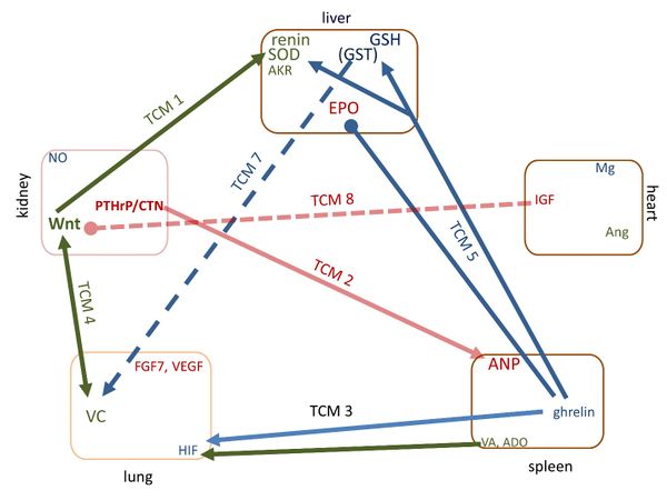 The first TCM treatment principle is “replenishing kidney Yin then replenishing liver Yin” which is usually used for kidney Yin deficiency and liver Yin insufficiency [3]. In physiological reality, the up-regulation of Wnt/β-catenin signaling is associated with the recovery of SOD levels [6], Wnt/β-catenin is the master regulator that controls multiple renin-angiotensin system genes [7], and SOD1 overexpression can restore impaired Wnt signaling [8], indicating that the Wnt (kidney Yin molecule) and renin/SOD (liver Yin molecules) are assisting each other. Therefore, this TCM method describes accurately the relationship of molecular signaling.