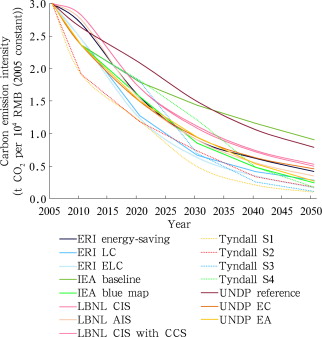 All scenarios in different studies demonstrate a continuous decrease in carbon emissions intensity. Tyndall S3 scenario resulted in the greatest decrease, followed by Tyndall S1 and ERI ELC scenarios. IEA baseline scenario resulted in the least decrease.