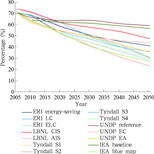 Looking into the comparative scenarios, from 2005 to 2020, carbon emission intensity decreases by about 48% in the IEA blue map scenario and LBNL AIS, and 50% in the UNDP EC scenario and UNDP EA scenario. Though such rates are higher than those in the baseline scenarios, it is still close to China’s official emission reduction target. In 2050, the comparative scenarios show much larger decreases relative to the baseline scenarios. The ERI LC scenario shows a carbon emission intensity of only 69% of that in its energy-saving scenario, while the carbon emission intensity in the ELC scenario reduces to 40% of that in the energy-saving scenario. Carbon emission intensity in the IEA blue map scenario is only 27% of that in its baseline scenario. Carbon emission intensity in the LBNL AIS is only 66% of that in its CIS. Carbon emission intensity in the UNDP EC scenario is 58% of that in its reference scenario, while in the EA scenario it is only 34% of that in its reference scenario.