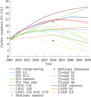 The comparative scenarios show even larger differences. Every scenario shows an emission peak except the UNDP EC scenario and ERI LC scenario. An emission peak is mostly found in 2030, as shown in the ERI ELC scenario, LBNL AIS, CIS with CCS, Tyndall S2 and S4, and UNDP EA scenario, with corresponding peak emission of 8.2 Gt, 9.7 Gt, 11.7 Gt, 7.0 Gt, 9.3 Gt, and 8.8 Gt CO2 . The Tyndall S1 and S3, and IEA blue map scenario set strict global emission reduction targets, so their trajectories show an emission peak in 2020, being 6.3 Gt, 8.8 Gt, and 8.4 Gt CO2 , respectively. McKinsey’s baseline emission in 2030 is similar to the IEA baseline scenario and ERI energy-saving scenario. As the McKinsey abatement scenario captures maximum technical reduction potential, it derives much lower carbon emission than what other scenarios predict, except the Tyndall S1.