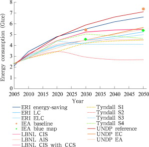 Non-fossil energy, including nuclear, hydro, wind, and solar energy, accounts for less than 7% of total energy consumption in 2005. By 2050, even the lowest estimation shows a share of about 14% (UNDP reference scenario, IEA baseline scenario). In Tyndall’s four scenarios, as they set a carbon emission trajectory, the share of non-fossil energy dramatically increases from 37% (S4) to 48% (S1) in 2050 in order to ensure economic growth. The IEA blue map scenario sets the target of global carbon emission reduction to half the current emission; hence the share of non-fossil energy reaches about 47% by 2050. The ERI LC scenario, LBNL AIS, and UNDP EA scenario show similar shares of non-fossil energy in 2050, ranging from 32% to 33%.