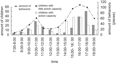 The number of children, based on whether they have action capacity, also differed at different times. During 7:00 to 13:00, the number of children who have little action capacity was greater than that of children who have capacity. The number of children with action capacity then increased and reached the same level as that of children who require supervision between 16:00 and 17:00, which is also the time when the amount of behavior types peaked. During the following period, the number of children who do not require supervision obviously decreased, whereas the other group of children became the primary users of residential landscape space.