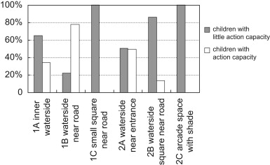 First, compared with children who act on their own, those with little action capability accounted for almost 100% of instances in areas 1C, 2B, and 2C. Clearly, such areas are more attractive to children who need supervision. Second, the percentage of children with little action ability in area 1A was approximately 70%, indicating that the space in area 1A also appeals, to a certain extent, to children who can act on their own. Third, the proportion of the two groups of children in area 2A was equal, showing that area 2A equally attracts both groups. Moreover, area 1B, the waterside space near the main road, was the only area wherein the proportion of children with action capability exceeded that of the other group. Area 1B is most attractive to children who act on their own.