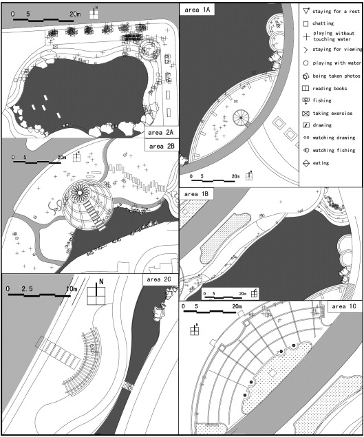 Areas 1A and 1B, which are on opposite sides of the same body of water, are both open spaces with landscape facilities (Table 4 ). The amount of dynamic behavior in area 1B, such as playing without touching the water (53 instances), playing with water (10 instances), and taking photos (7 instances), was slightly greater than that in area 1A (42, 2, and 2, respectively). However, behavior type, density, and distribution for both areas were very similar (Fig. 3 and Table 1 ).
