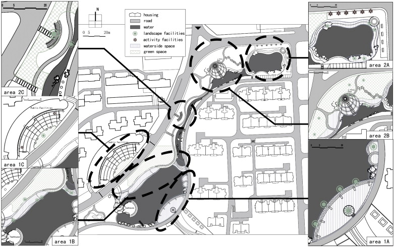 Six areas, namely, 1A, 1B, 1C, 2A, 2B, and 2C, were chosen for observation from the central landscape of the residential quarter (Fig. 2 ). Various symbols were used to mark on plan. These symbols represent the type, quantity, location, direction, and distribution of child behavior. Moreover, the time the behavior took place and factors affecting their behavior (e.g., with parents' attention, simultaneous occurrence of behaviors different behavior types, and so on) were also recorded in data sheets.