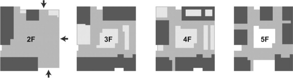 | Investigated sites | Atrium | Stair-case | Elevator | Escalator | Ramp |