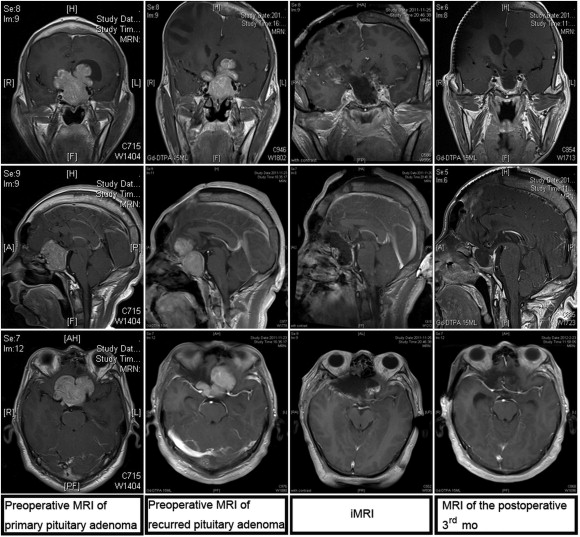 A total of 30 patients with large pituitary adenoma underwent microscopic tumor resection under the assistance of an iMRI system; 26 cases received surgery through the nasal–transsphenoidal approach, and the remaining four cases received surgery through the pterion approach. iMRI was performed one or two times depending on the need of the surgeon. If a residual tumor was found, further resection was conducted under iMRI guidance.