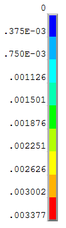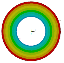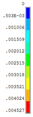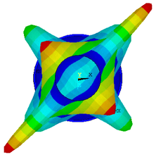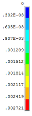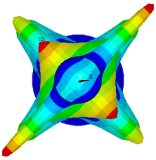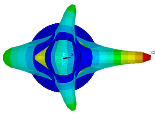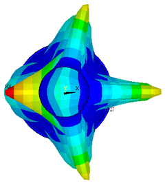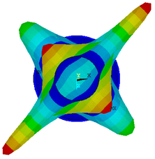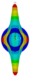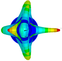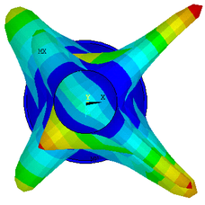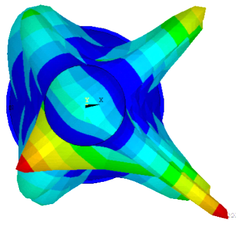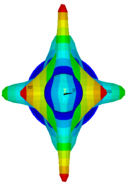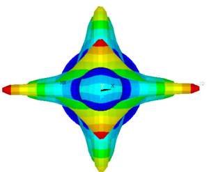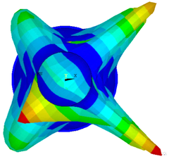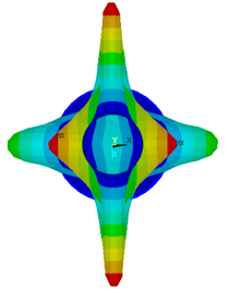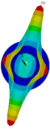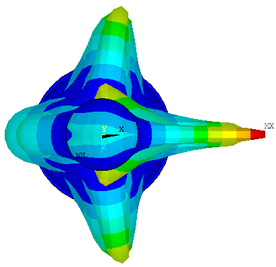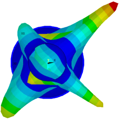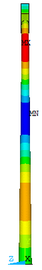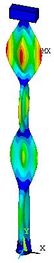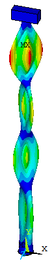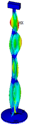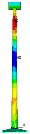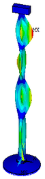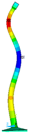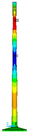A primeira e a segunda frequências são referentes aos primeiros modos de flexão nos planos XY e YZ, respectivamente (o eixo Y está posto na vertical no ANSYS). Há uma pequena diferença entre estas frequências devido à diferente disposição geométrica da nacele em relação aos planos XY e YZ. A terceira e a quarta frequências referem-se a outros dois modos de flexão nos planos XY e YZ, respectivamente. Os modos de vibração 5 e 6 são modos de oscilação ovais (modos de ovalização) com mesma frequência, que não são captados na análise com EF de barra. Estes tipos de modos surgem devido à reduzida espessura da parede da torre, entretanto, podem ser eliminados ou posicionados em frequências superiores (de menor importância para a resposta da estrutura) com a utilização de enrijecedores transversais à torre (anéis de rigidez). A sétima frequência é referente ao primeiro modo de torção em torno do eixo Y. Os modos 8 e 9 também são modos de flexão nos planos XY e YZ, respectivamente. Tornam a aparecer modos de ovalização nas frequências 10, 11, 12, 13, 14 e 15; estes são modos de vibrações locais acoplados, pois enquanto em um modo de vibração de flexão ou de torção globais tem-se deslocamento segundo um determinado eixo, nos modos de oscilação ovais há deslocamentos em mais de um eixo coordenado. Destes modos de ovalização, os seguintes pares têm a mesma frequência: 10º e 11º; 12º e 13º; e, 14º e 15º. Finalmente, as frequências 16 e 18 correspondem a outros modos de flexão nos planos XY e YZ, respectivamente; e a frequência 17 a mais um modo de torção em torno do eixo Y.