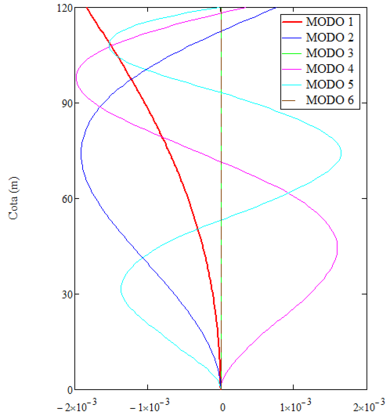 | Figura 4. Deslocamentos transversais à torre dos cinco primeiros modos de vibração |