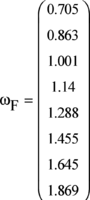 na qual: é coeficiente adimensional de sustentação tomado igual a 0,5, a favor da segurança, para a faixa de número de Reynolds em análise [23,27]; é a frequência angular de desprendimento de um par de vórtices de von Kárman, em rad/s, que varia em relação ao nível geral do terreno, pois o carregamento utilizado refere-se a situação em que a velocidade de vento se iguala a velocidade crítica apenas no topo da torre (condição para possível excitação do modo de vibração fundamental). Na Eq.(64) tem-se o vetor de frequências angulares de desprendimento de um par de vórtices quando a torre é discretizada em EF de barra com n = 8: