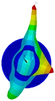 Outra questão observada no modelo com base flexível é notada no 8º modo, por exemplo, no qual há rotações e deslocamentos diferenciados em relação ao respectivo modo (3º modo de flexão YZ) do modelo engastado na base, tanto ao longo do tubo da torre quanto na nacele, que não mais rotaciona apenas em torno do eixo X. Uma característica a mais, relacionada ao modelo com base flexível, é a inexistência de simetria dos modos de ovalização em relação aos planos coordenados XY e YZ, quando comparados com os respectivos modos de ovalização do modelo engastado na base.