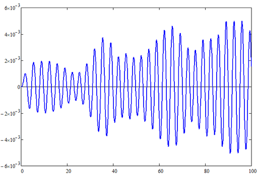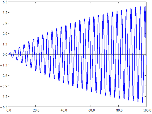 Considerando-se nulos os vetores de condições inicias (deslocamentos e velocidades), o gráfico de deslocamentos do topo da torre, quando submetida ao vetor de forças ressonantes da Eq.(57), é mostrado na Figura 8.