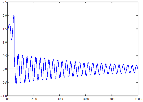 Desta forma, resolveu-se realizar uma segunda análise que consiste no fato de avaliar os deslocamentos quando a excitação atua em parte do tempo de análise. Além disso, é considerado que durante a atuação do carregamento a torre vibra em torno da posição de equilíbrio estático definida pela atuação da força eólica média (estabelecida pela velocidade média de vento ), ou seja, a parcela flutuante do vento, adotada como harmônica, incide em torno da sua parcela média. Na Figura 9 é apresentada a função dos deslocamentos do topo da torre (em torno do deslocamento estático) quando esta é submetida ao vetor de forças da Eq.(57) durante 5 s (semelhante ao efeito de uma rajada). Após o tempo de atuação da força (), a torre passa a movimentar-se sob vibração livre amortecida em torno da posição de deslocamento nulo; entretanto, mesmo após 100 s de análise, a torre continua a vibrar com amplitude relativamente elevada (15 cm), acarretando problemas de fadiga do material.