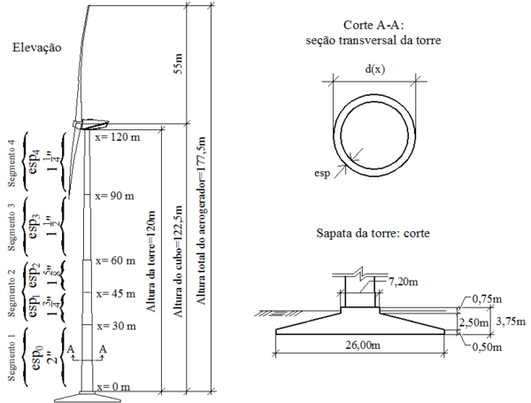 Foi considerada uma torre tubular de aço S355J2 [17] que dá suporte a um aerogerador no padrão SWT-3.2-113 [18], conforme características especificadas na Tabela 1.